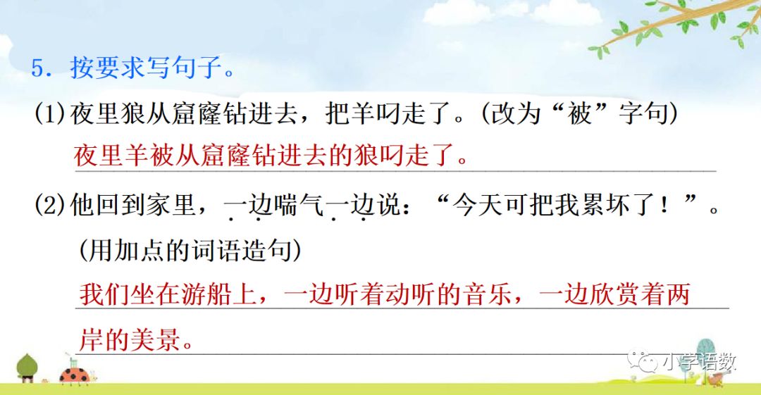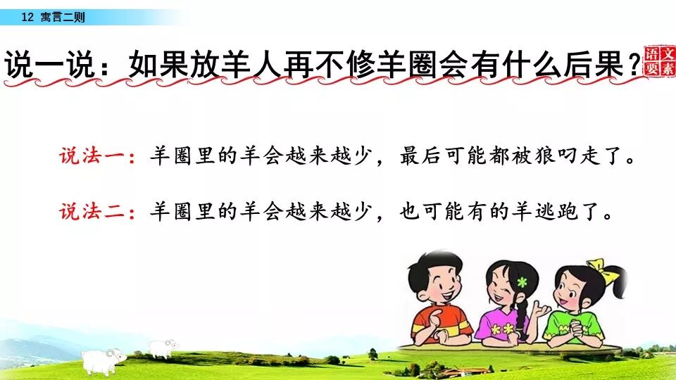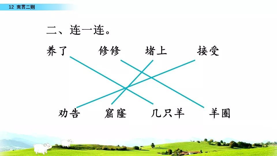 第一组中,下句比上句多了“赶紧”一词,说明养羊人知道了修羊圈的重要性,急忙去堵窟窿。如果不赶快堵上那个窟窿,羊还会被狼叼走。