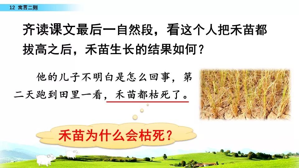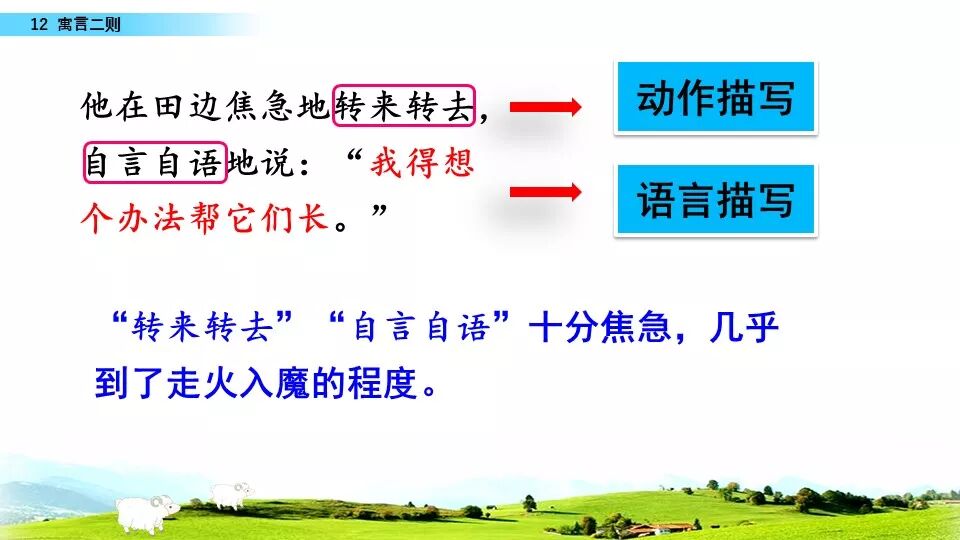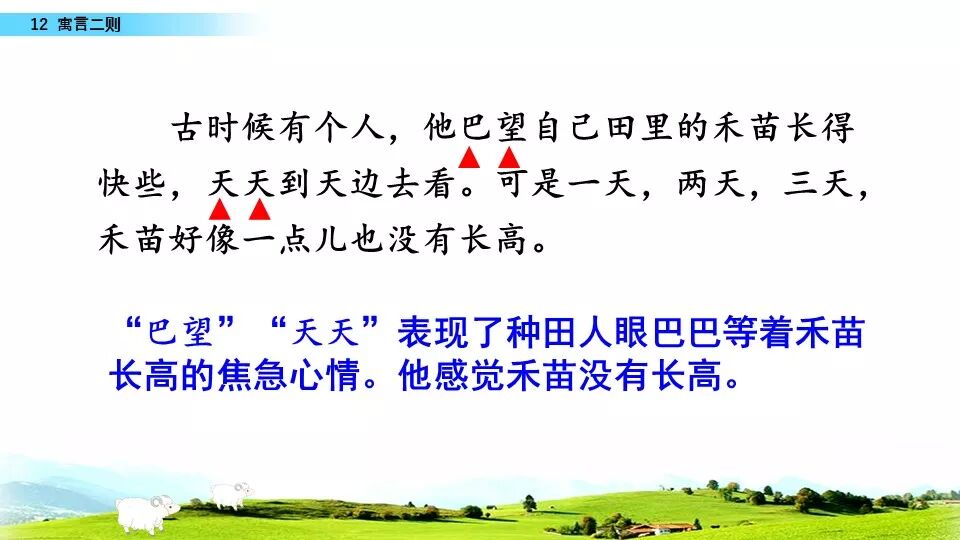 第二组中,下句比上句多了“焦急地”这个词语,写出了那个人希望禾苗快点儿长大的急切心情。
