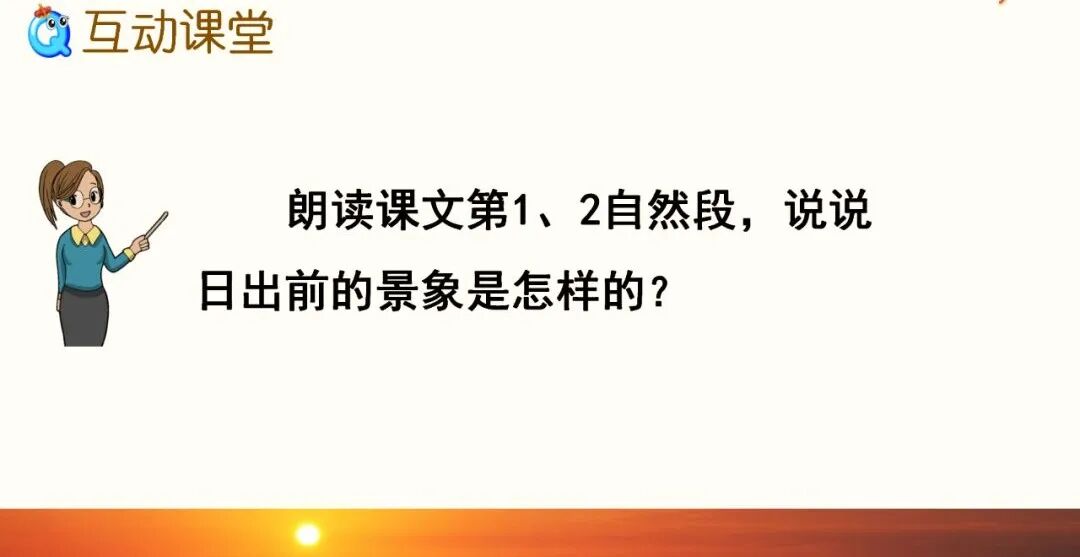 日出时,天空中出现了太阳的小半边脸,接着使劲儿向上升,到了最后太阳终于冲破了云霞,完全跳出了海面。