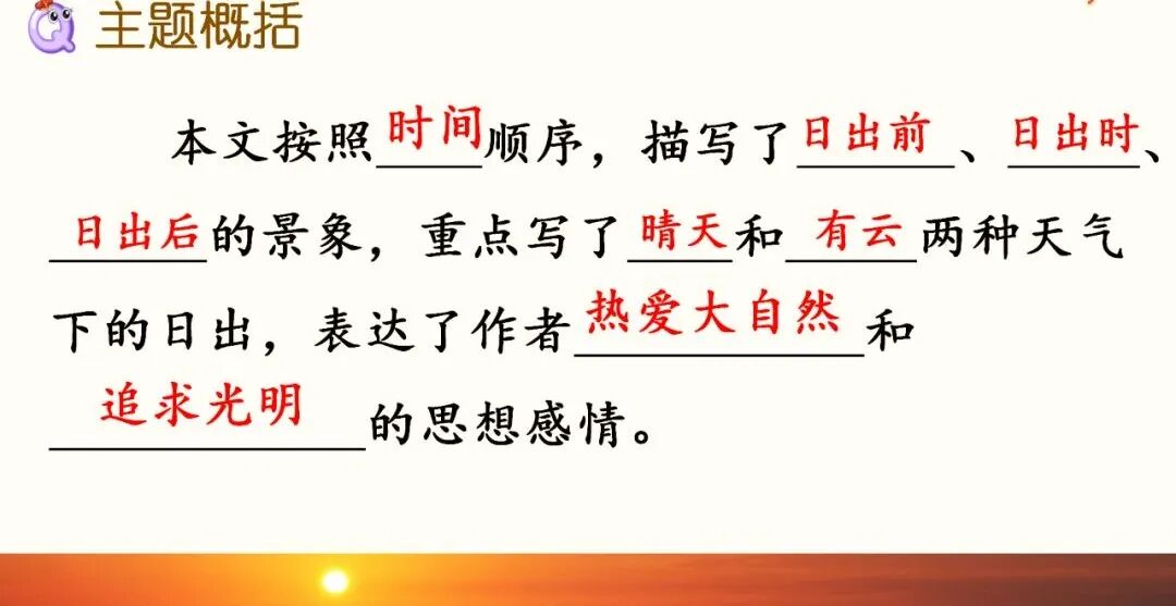 7.本文通过描写太阳从海上上升起来的集中不同景象,赞美了海上日出这一伟大奇观,表达了作者热爱自然,追求光明的思想感情。