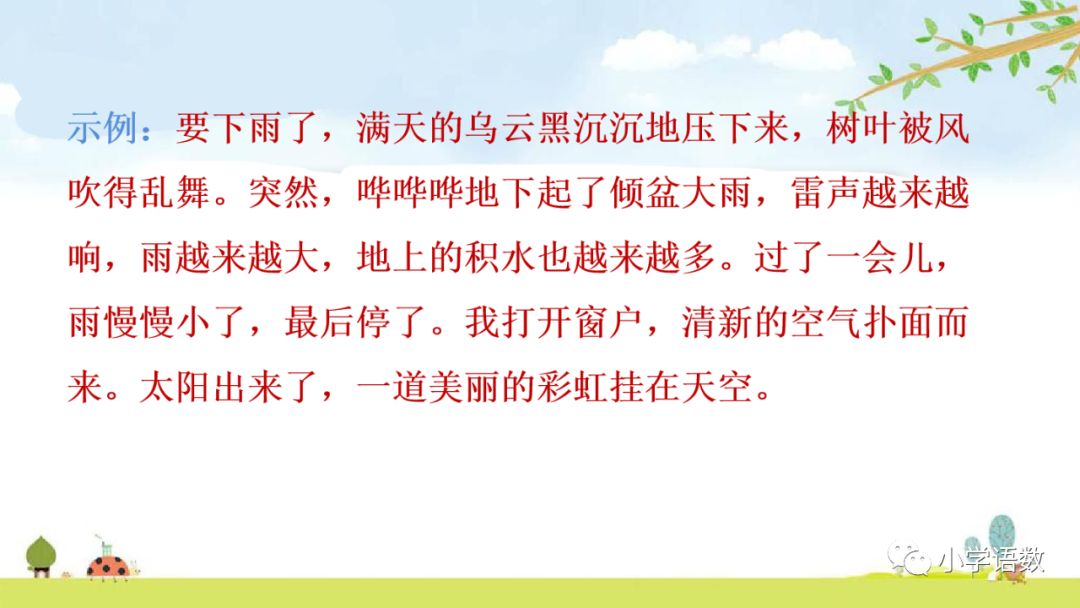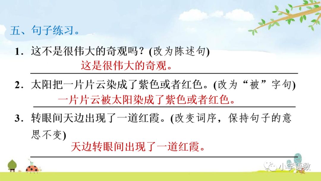 2.转眼间天边出现了一道红霞,慢慢地在(扩大)它的范围,加强它的亮光。