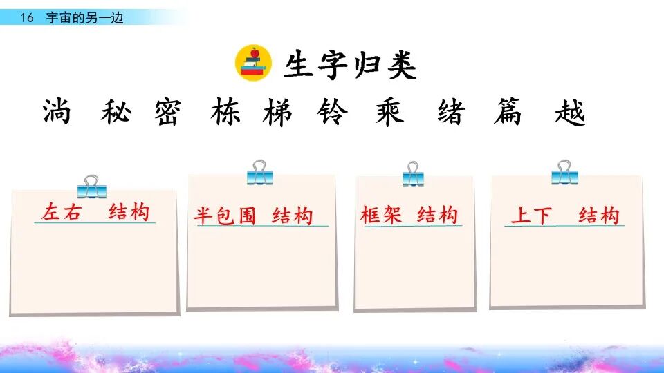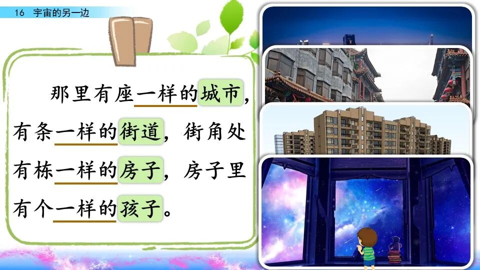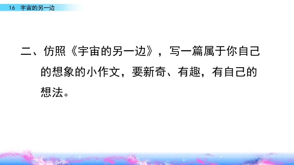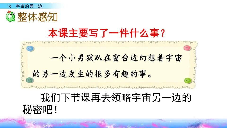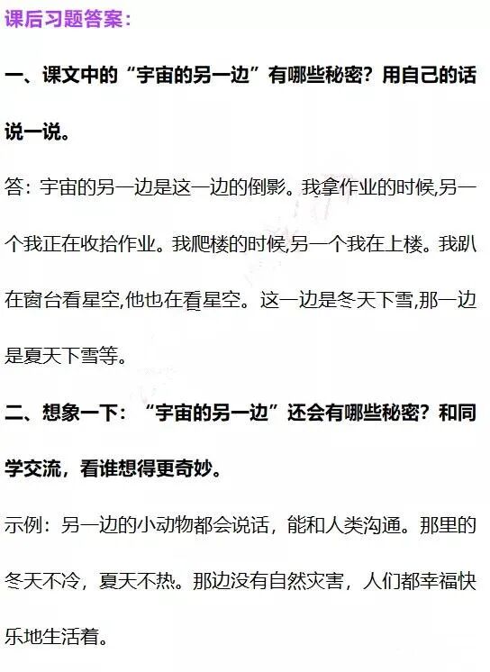 《宇宙的另一边》是部编版三年级下册第五单元的第一篇课文,是精读课文,讲了作者趴在窗台,看着浩瀚的星空,产生的无尽遐想。在宇宙的另一边有很多神奇的秘密。有个做着相反动作的一个“我”,所有的事物都和这边截然相反。文中的一切都充满了纯真的想象,给孩子们增加了无限的想象空间。