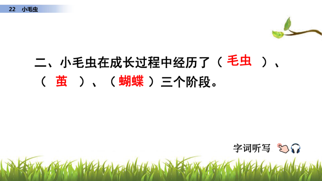 小毛虫在成长过程中经历了( 小毛虫 )、(茧)、(蝴蝶)三个阶段。