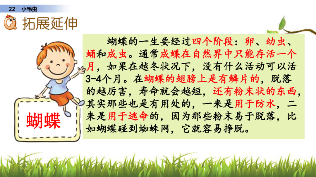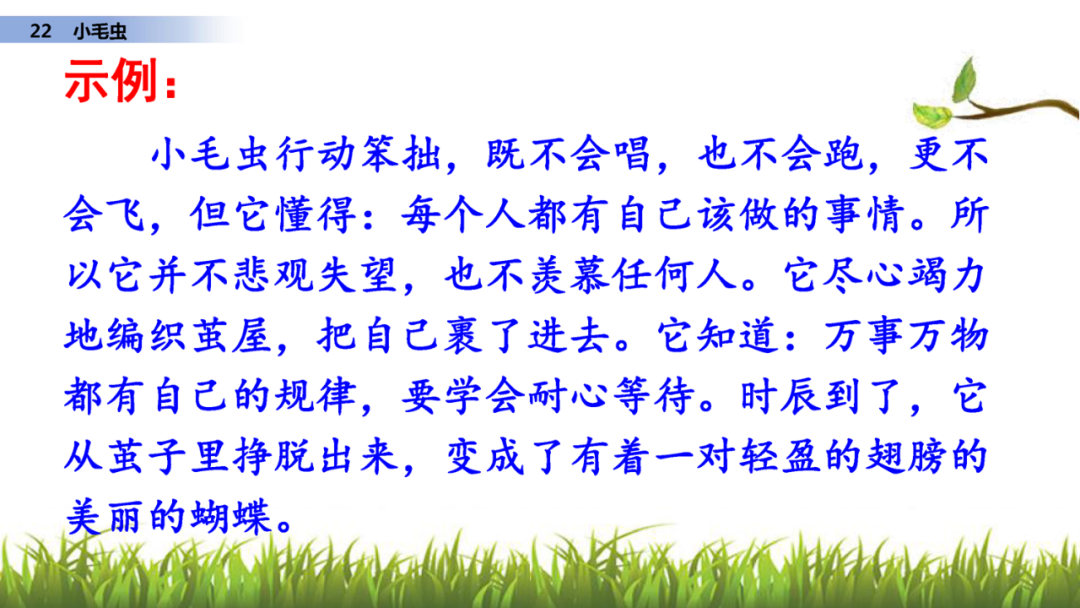 本文写了一条可怜而又笨拙的小毛虫尽心竭力地工作,最终脱胎换骨,羽化成为美丽的蝴蝶的故事。告诉我们:自然界的一切事物都需要按照自己的规律发展,只要做好自己分内的事,不怕困难,就会取得成功。