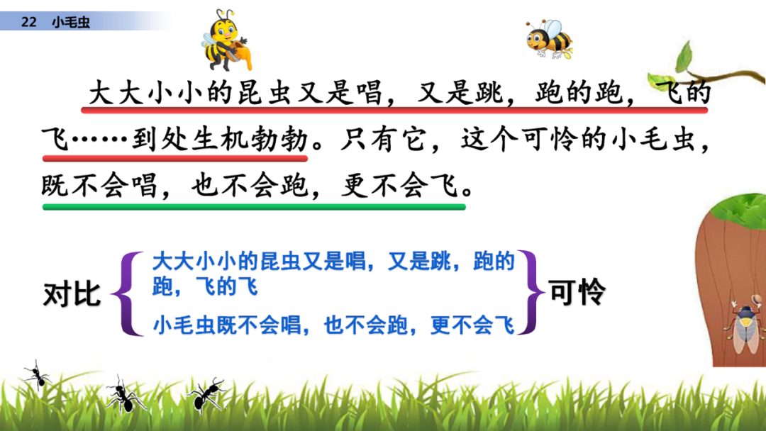 昆虫有飞的、跑的、唱的、跳的,这一切似乎都和小毛虫无关,因此,它感觉自己很“可怜”,很“笨拙”。