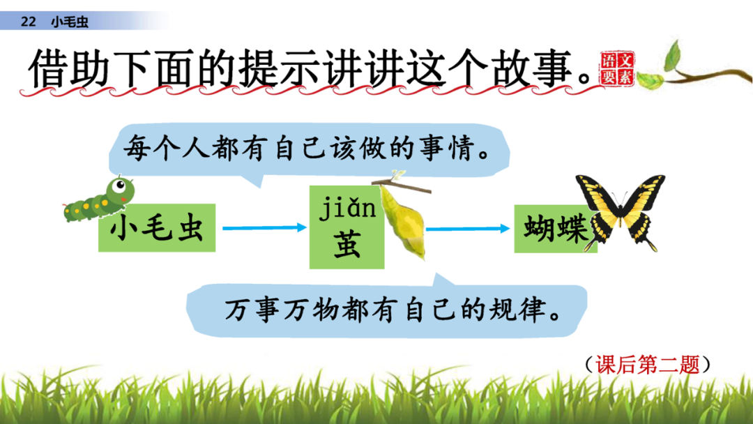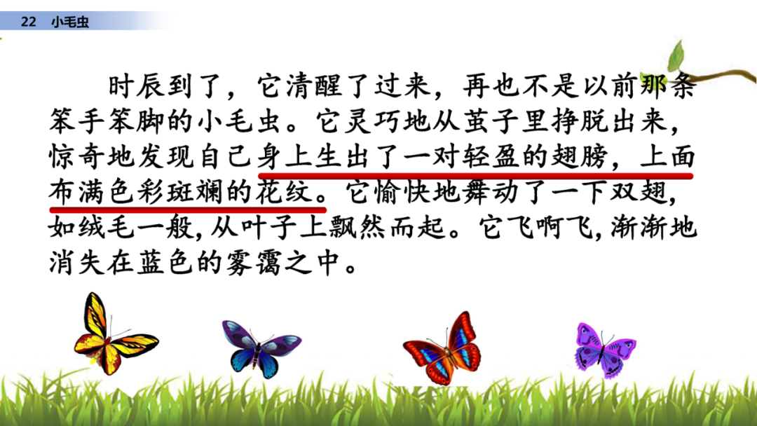 二、小毛虫经历了哪些变化呢?画出相关词句借提示讲讲这个故事。