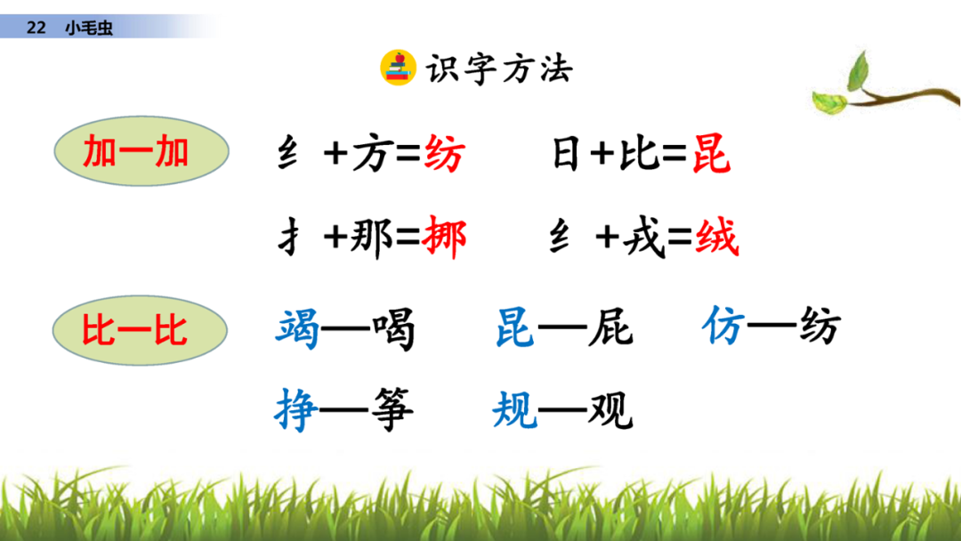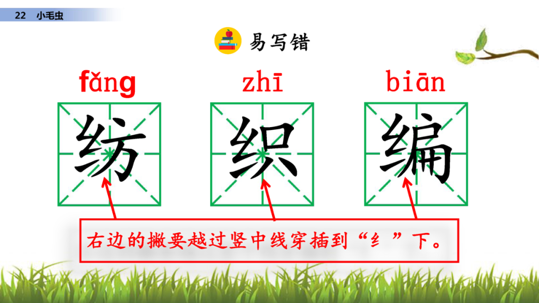 纺、织、编:部首都是“纟”,笔顺是撇折、撇折、提。