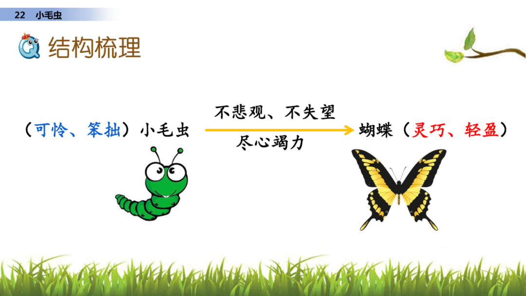 因为小毛虫不悲观、不失望,尽心竭力地工作,所以变成了灵巧轻盈地蝴蝶。