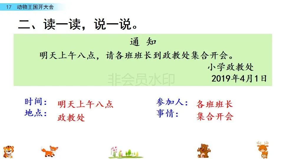 明天早上九点,请参加少先队大队部会议的各班班长,准时到校大队部活动室参加关于开展“节约每一滴水”的倡议活动。