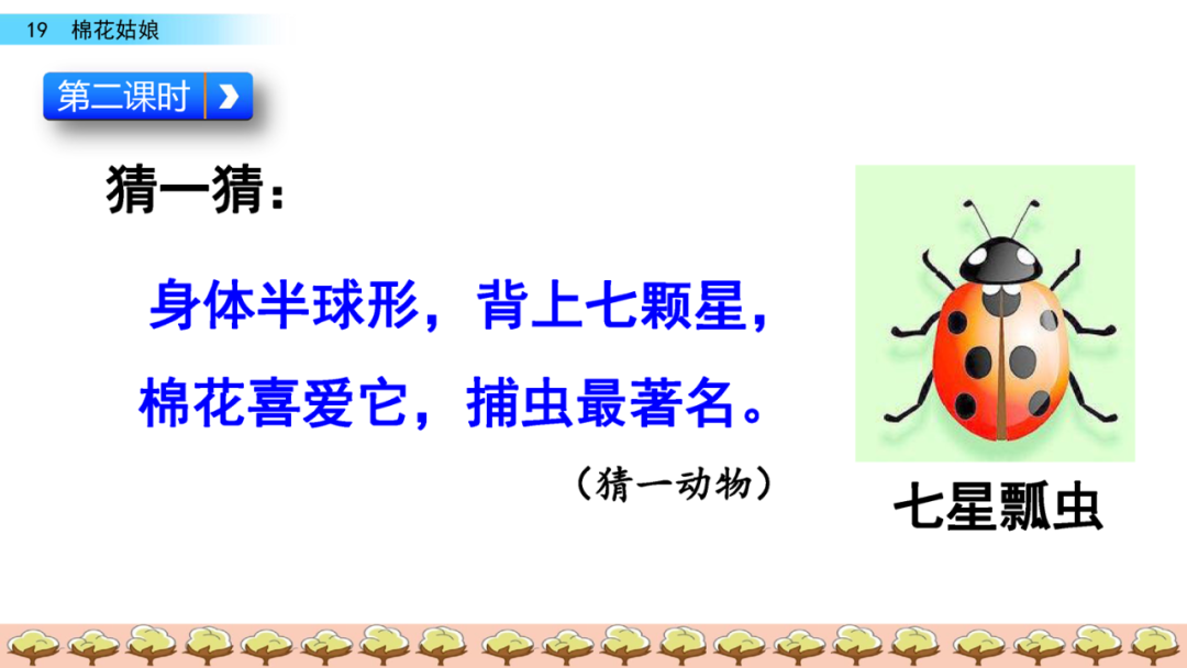 3、棉花姑娘惊奇地问:“你们是谁呀?”小虫说:“我们身上有七个斑点,像七颗星星,大家都叫我们七星瓢虫。”