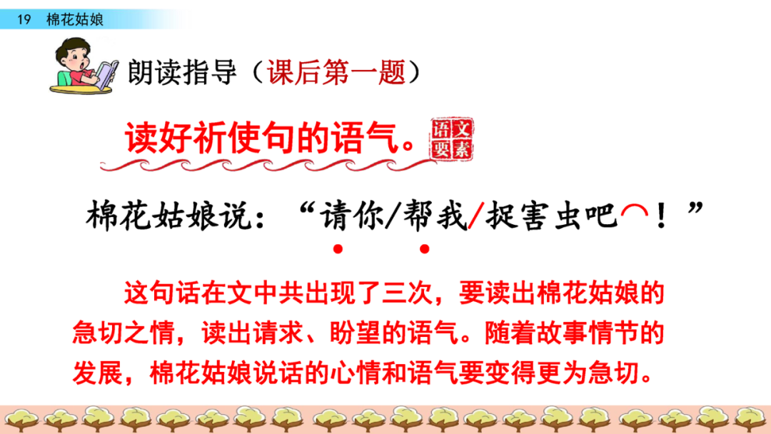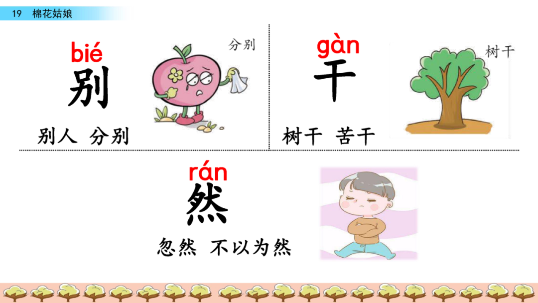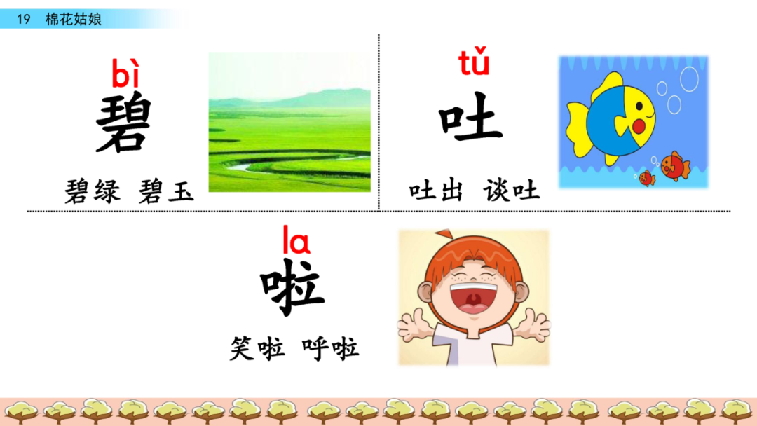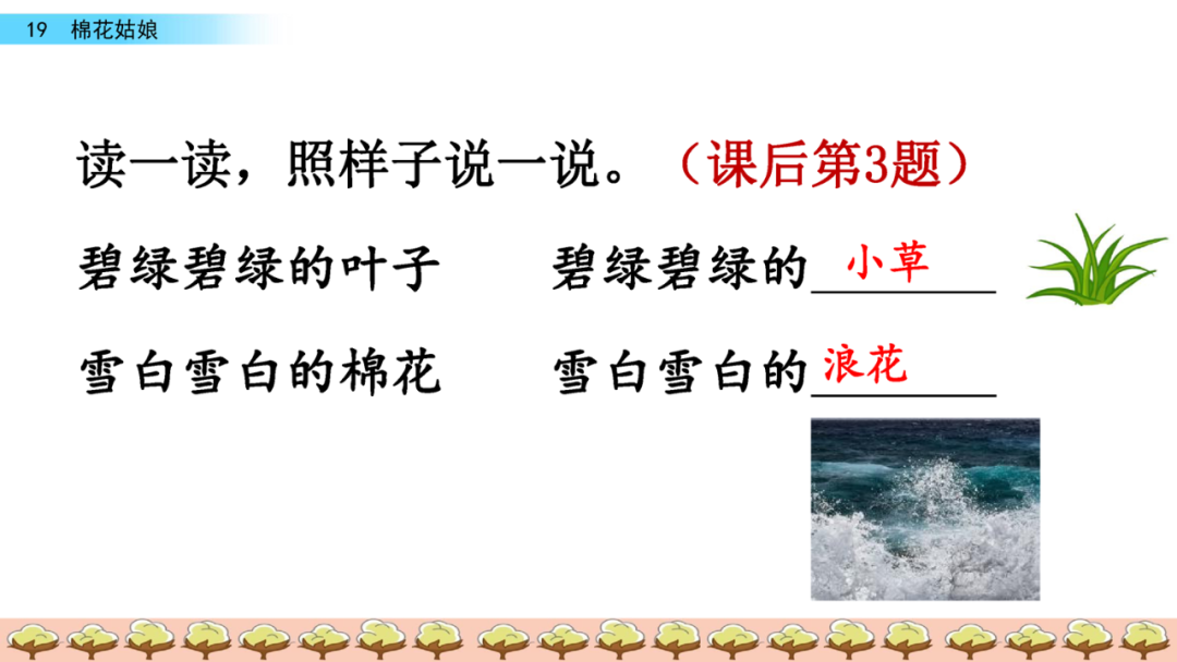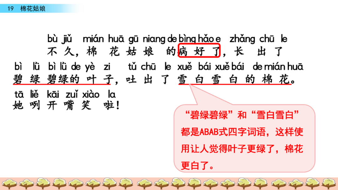 “碧绿碧绿”、“雪白雪白” 叠词的连用表达了棉花姑娘大病痊愈后的健康与喜悦。“她咧开嘴笑啦”,让读者也舒心一笑。
