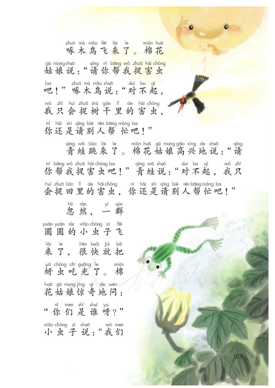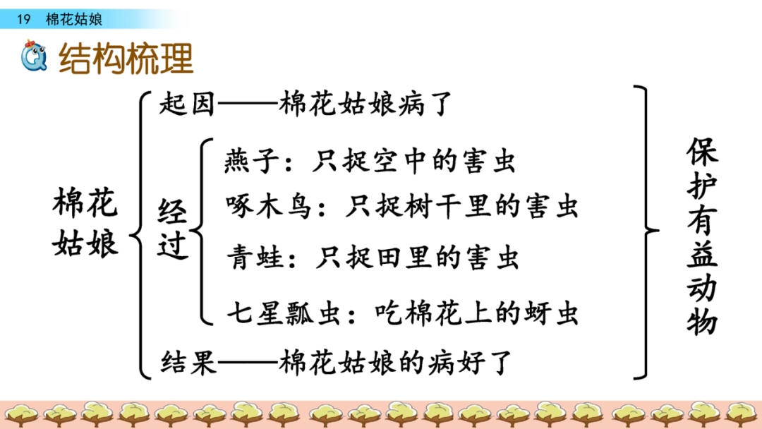 《棉花姑娘》是一篇童话,寓生物常识于形象的故事之中。课文通过棉花姑娘请求燕子、啄木鸟等的动物医生给自己治病的故事,告诉我们燕子、啄木鸟、青蛙和七星瓢虫分别吃什么害虫的科学常识。 通过学习使我们对科学常识产生浓厚的兴趣,培养了学生留心观察、探索和发现身边的科学常识的能力。树立保护益虫和益鸟的意识。