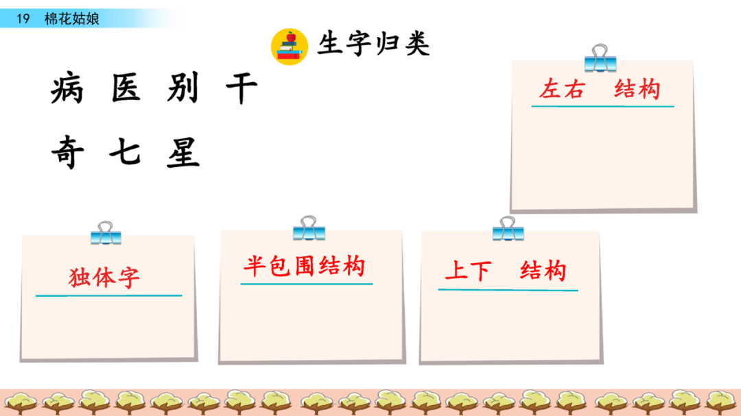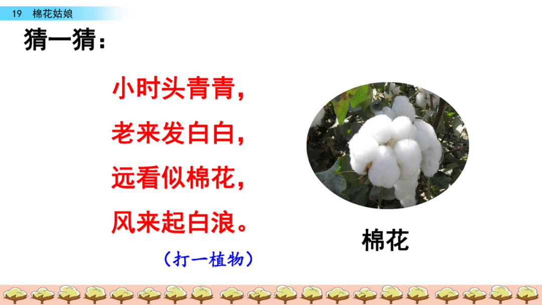 不久,棉花姑娘的病好了,长出了碧绿碧绿的叶子,吐出了雪白雪白的棉花。她裂开嘴笑啦!