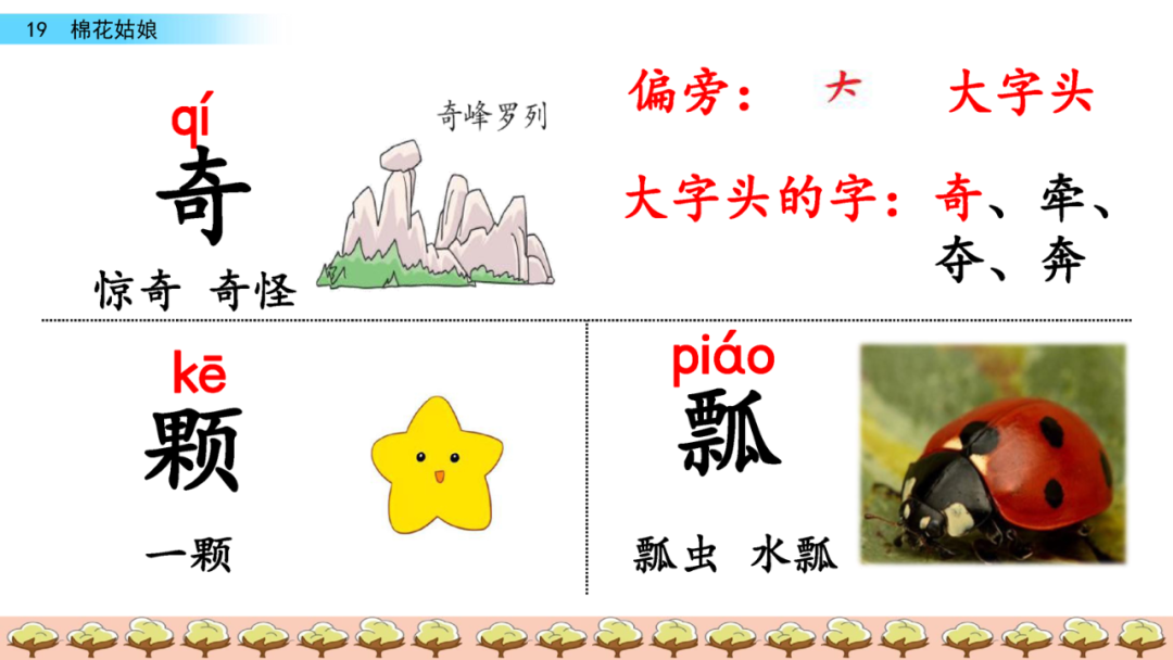惊奇”一词表达了棉花姑娘的惊讶与喜悦之情。小虫的话告诉我们七星瓢虫的样子:有七个斑点,就像七颗星星。