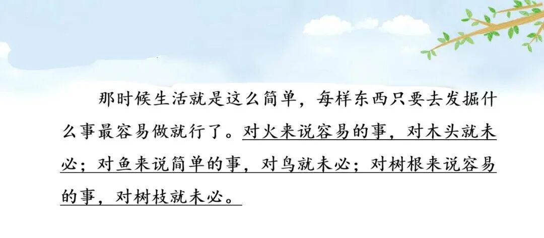 示例1:这世界还相当有秩序。小树迎着阳光,努力向上生长;大公鸡在早晨打鸣,饿了在地上找虫子吃,晚上休息;猫头鹰白天睡觉,晚上出来活动……生活就是这么简单。