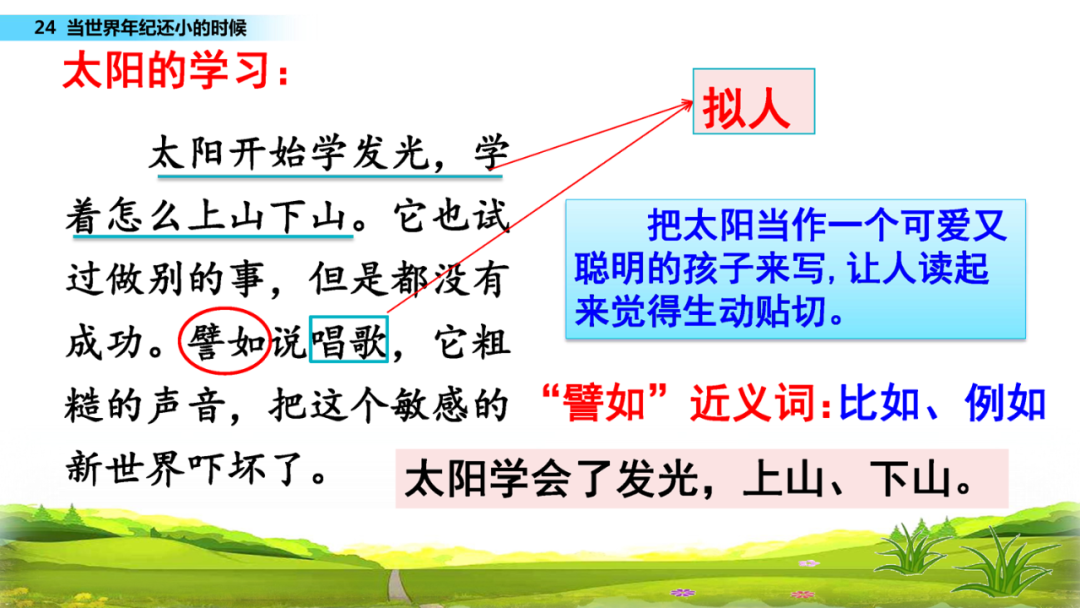1、太阳通过学习学会了发光、上山和下山。