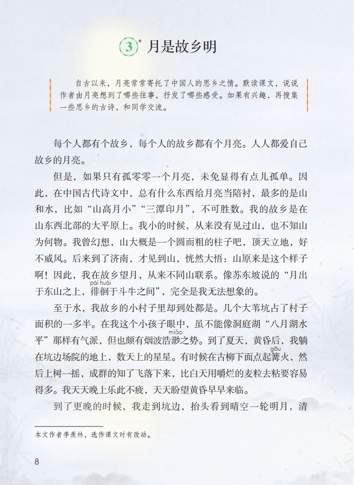 2、 以后到了济南,才见到山,恍然大悟:山原来是这个样子啊!因此,我在故乡望月,从来不同山联系。像苏东坡说的“月出于东山之上,徘徊于斗牛之间”,完全是我无法想象的。