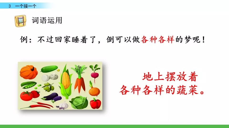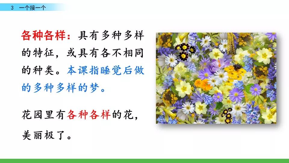 各种各样:具有多种多样的特征,或具有各不相同的种类。本课指睡觉后做的多种多样的梦。