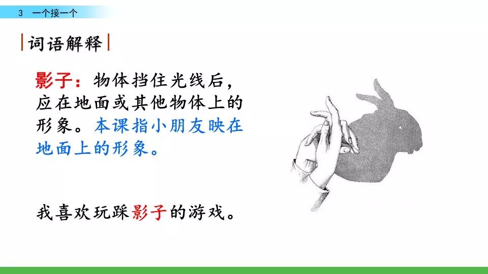 影子:物体挡住光线后,应在地面或其他物体上的形象。本课指小朋友映在地面上的形象。