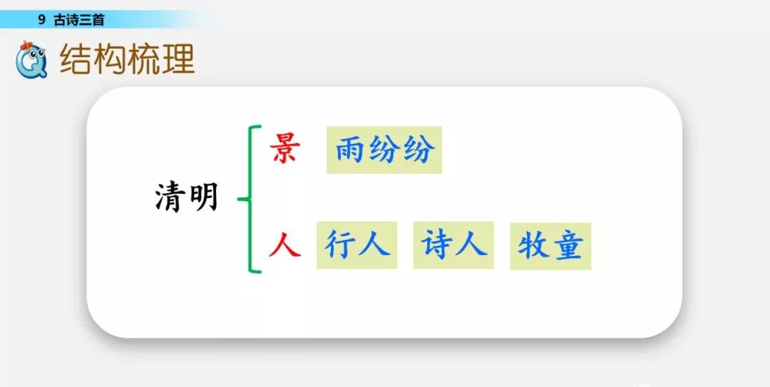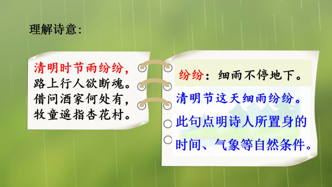 诗的前两句:这两句从“清明时节”、“雨纷纷”“欲断魂”交代了时间、场景、心情。这样的天气,这样的心情,找个地方避雨休息,借酒浇愁就是水到渠成的事情,为后文问哪里有酒家做铺垫。