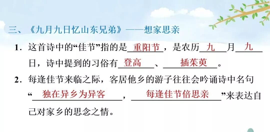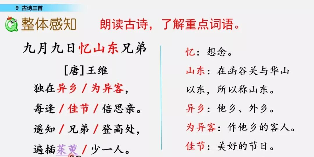 独在异乡/为异客,每逢/佳节/倍思亲。