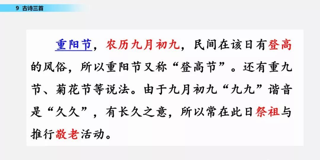 答:写的是重阳节,外出的人登高望远思念家人,在远方想象家里的亲人也在这一天登高望远,插上茱萸,在想念自己。我们这儿叫老人节,给家里的爷爷奶奶姥姥姥爷们过节,人们会逛庙会,为老人祈福。