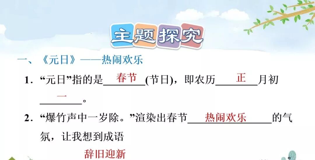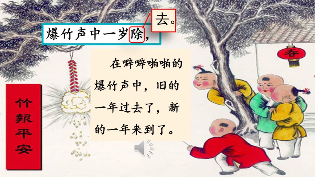 诗的前两句:这两句写“元日”(春节)的传统习俗有放爆竹、喝屠苏酒,用来渲染春节祥和欢乐的气氛。