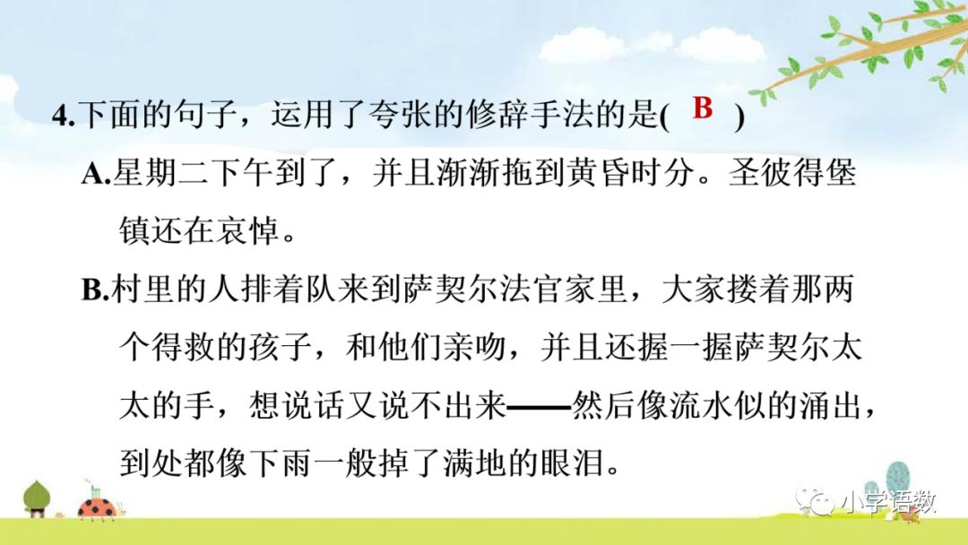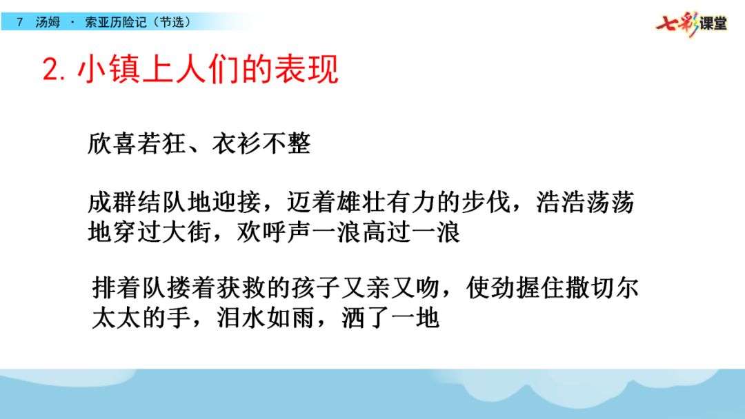 这一夸张描写,表现了小镇上的人们为汤姆和贝琪的归来而高兴的心情,与上文撒切尔太太和波莉姨妈的悲痛形成鲜明对比,这样由悲转喜,充满了戏剧色彩。
