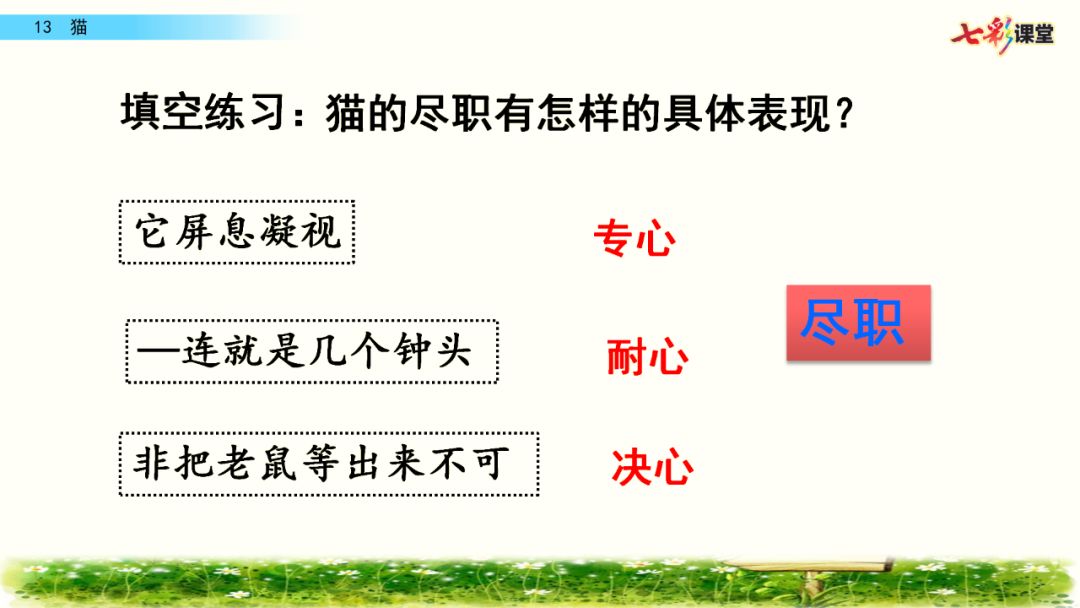 3、可是,它听到老鼠的一点响动,又是多么尽职。它屏息凝视,一连就是几个钟头,非把老鼠等出来不可!