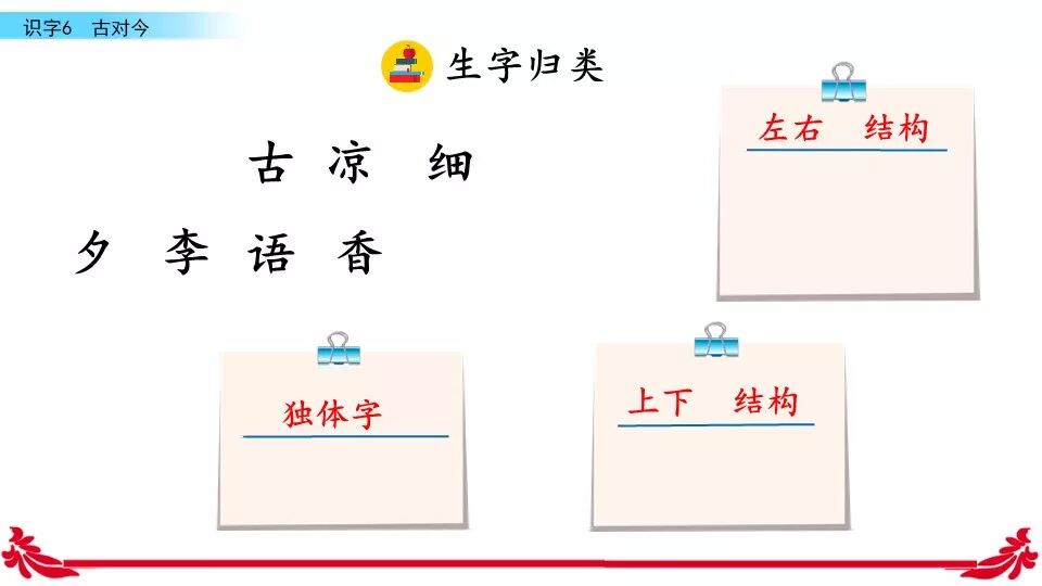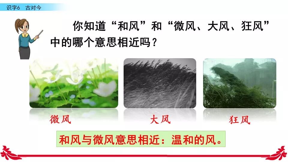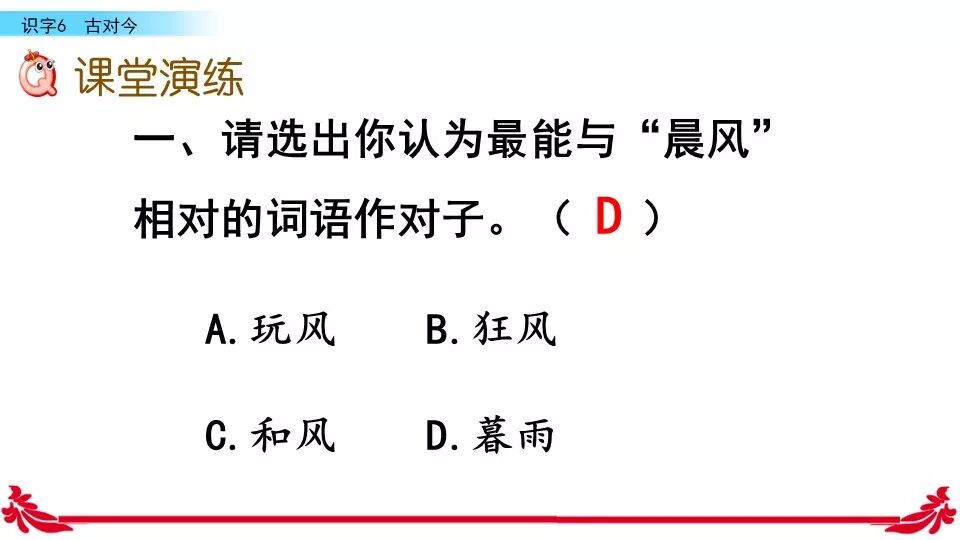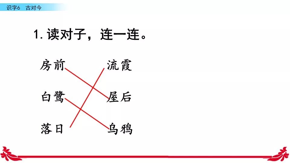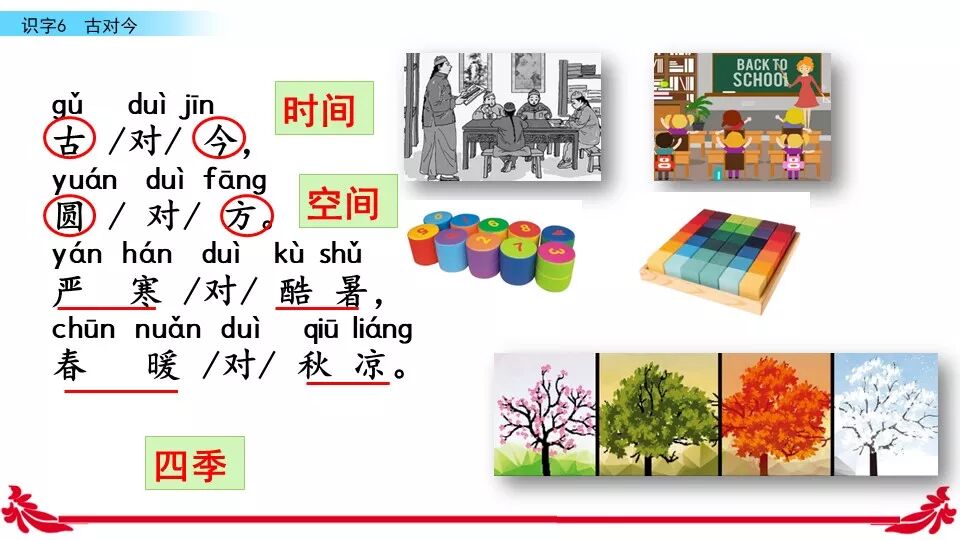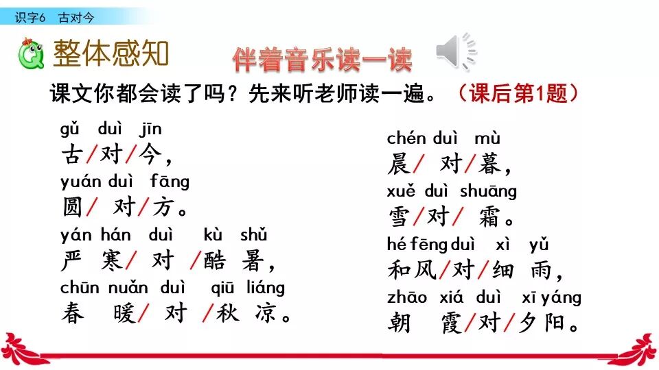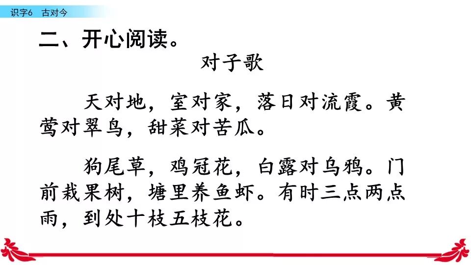 《古对今》是一首对韵歌。这首对韵歌以对子的形式描绘了自然之美。课文共有三个小节组成,每小节四行,结构相同:每一小节的前两行是单音节词对单音节词,如“古对今”“晨对暮”“桃对李”:后两行是双音节词对双音节词,如“严寒对酷暑”“和风对细雨”“莺歌对燕舞”。三段韵文,描绘了四季轮回,冬去春来,昼夜交替,欣欣向荣,万物生长的自然规律。