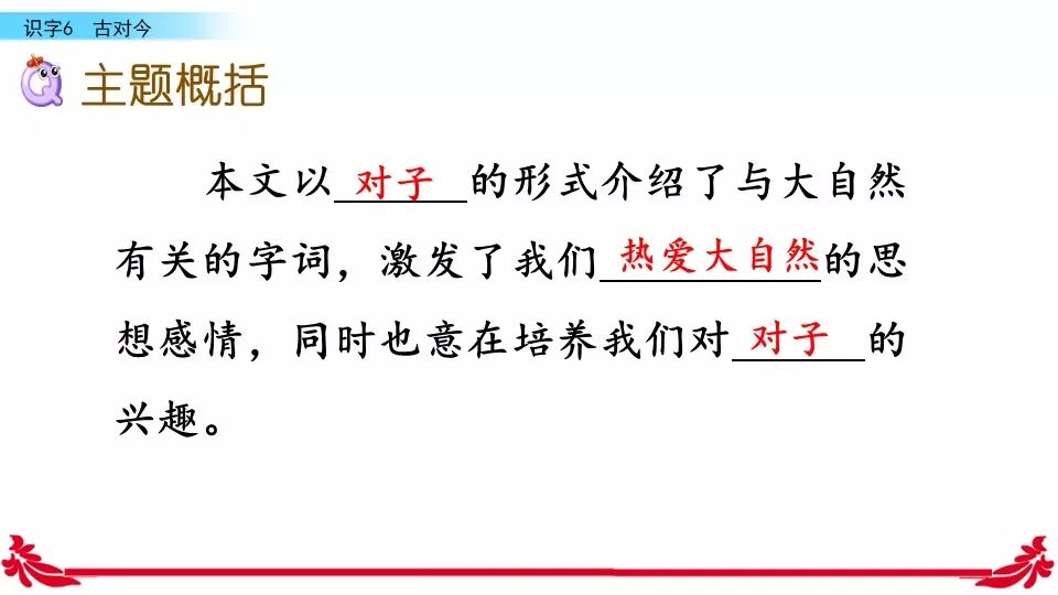 课文以对对子的形式展开,描绘了大自然的丰富多彩,激发我们热爱大自然的感情,也激发我们积累对子的兴趣。