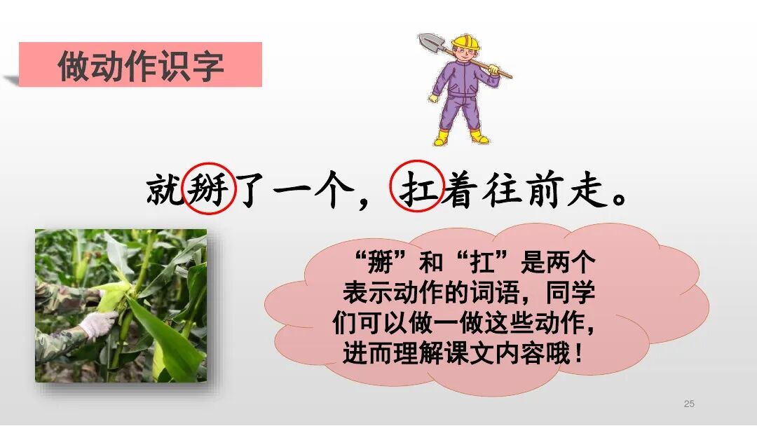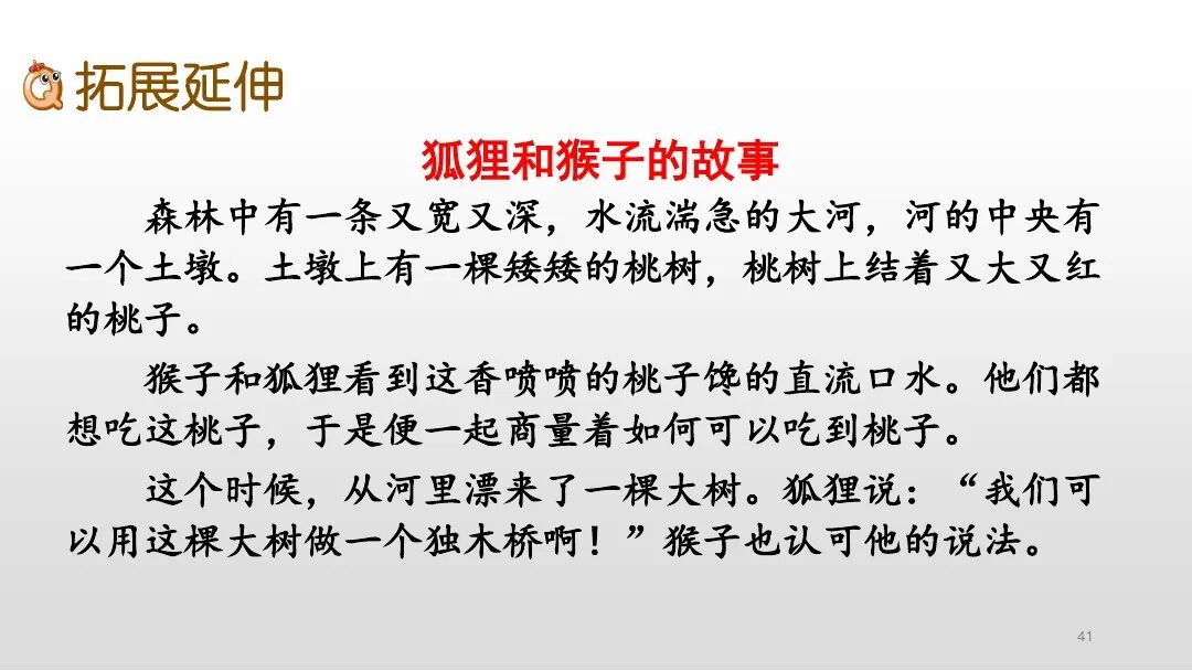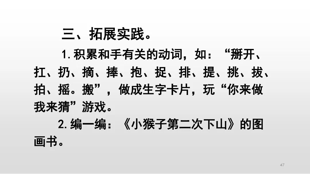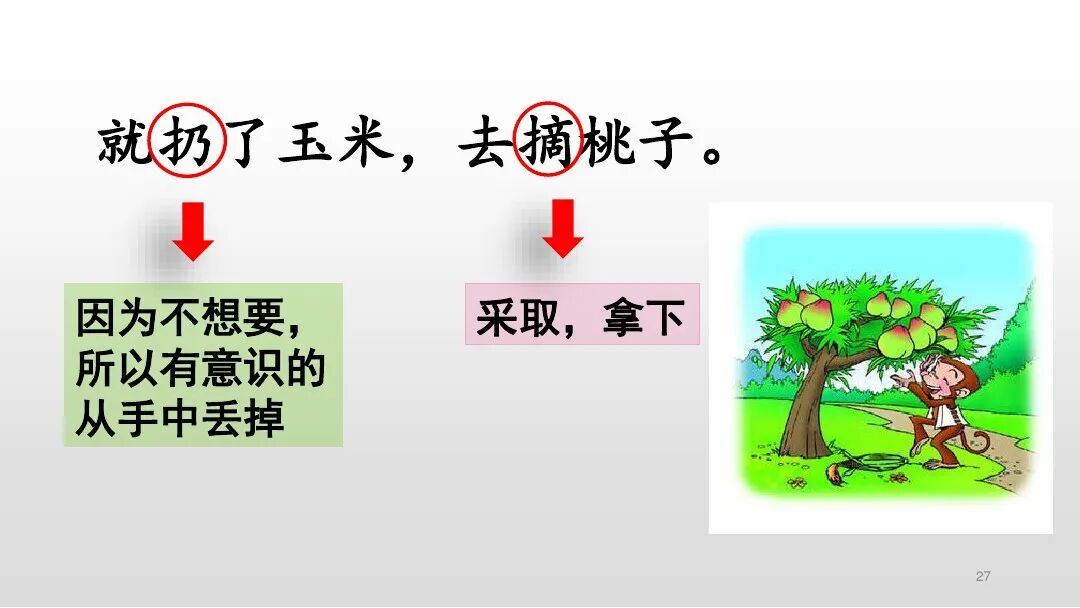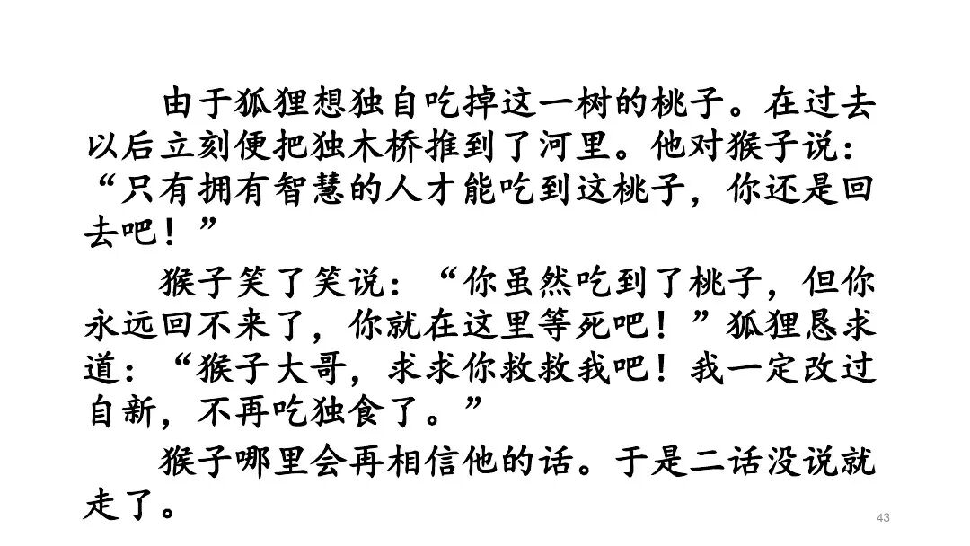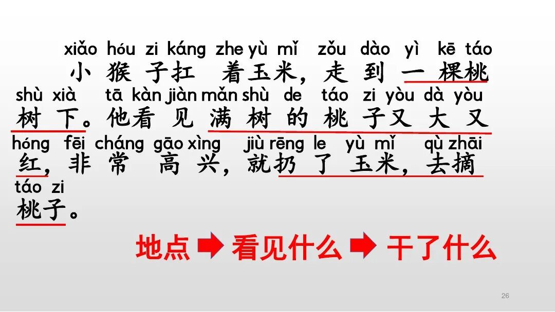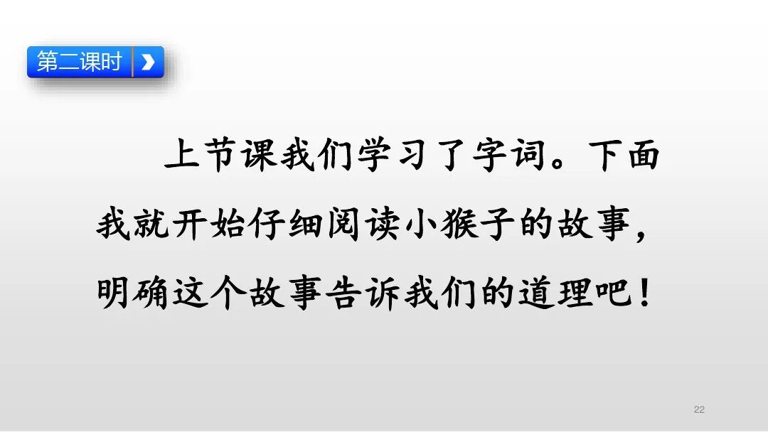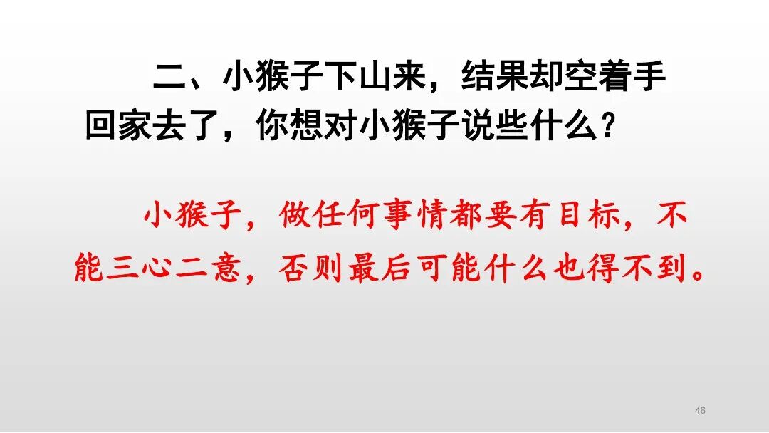《小猴子下山》是一篇童话,故事情节生动有趣。课文讲了一只小猴子下山来,先掰了一个玉米,看见桃子就扔掉玉米去摘桃子,看见西瓜就扔掉桃子去摘西瓜,看见兔子就扔了西瓜去追兔子,最后,兔子跑进树林不见了, 小猴子一无所获。这个故事教育我们做事要有明确的目的,始终如一;如果三心二意,将一事无成。
