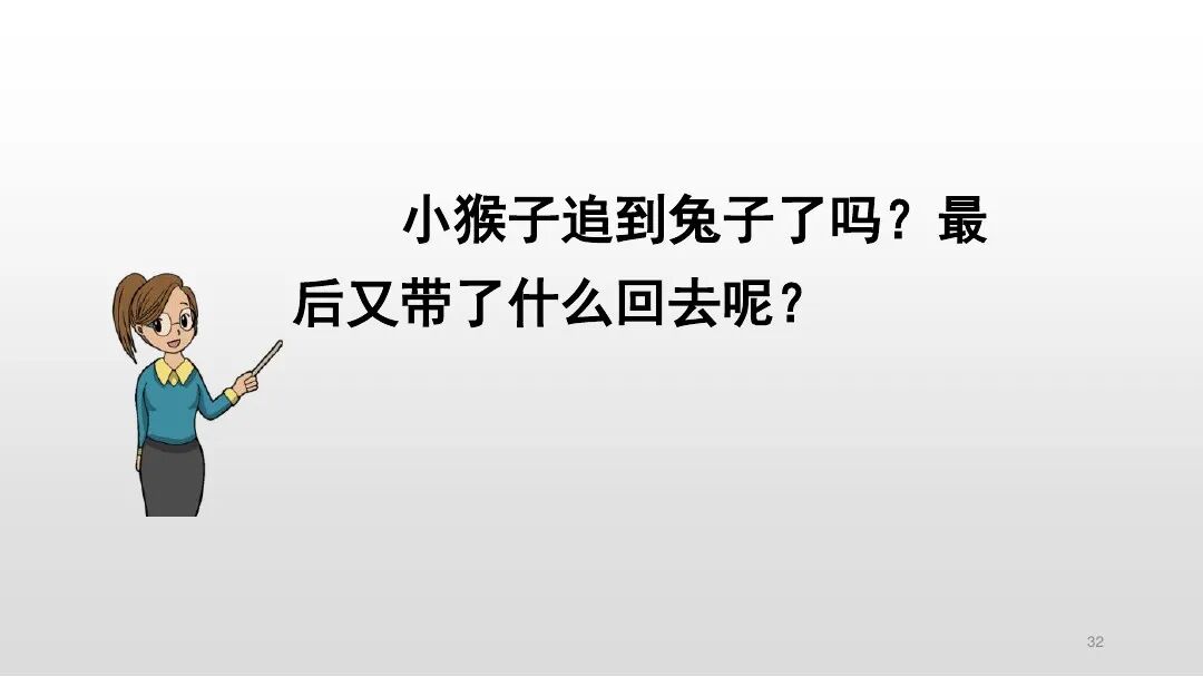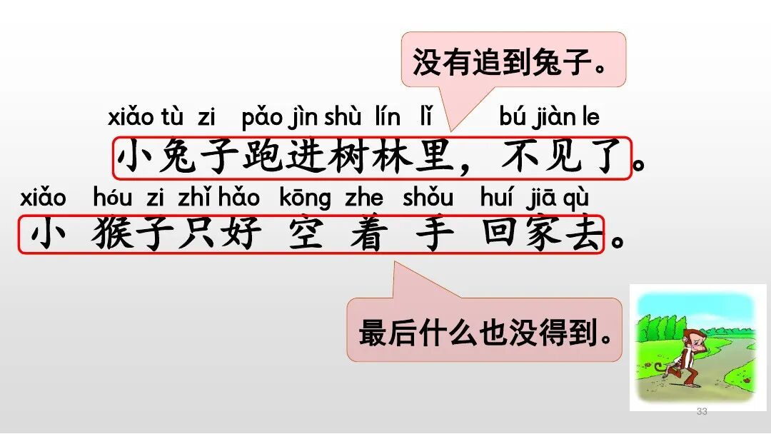 四、小猴子只好空着手回家去。 小兔子跑进树林里。