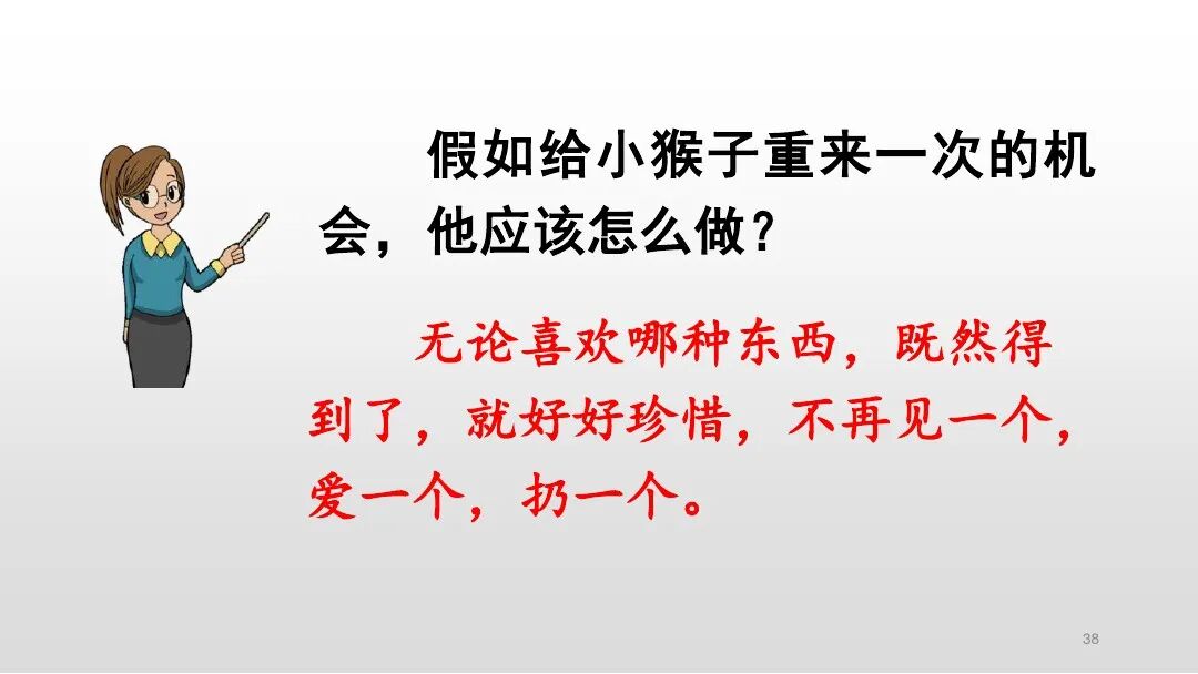 五、因为小猴子总是见了这个,就丢了那个,喜新厌旧,做事不专一,有始无终。我想说:“小猴子你做事太不专心,三心二意,想一出是一出了。”
