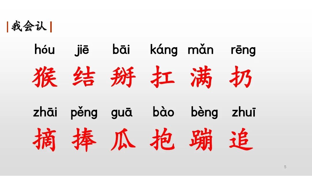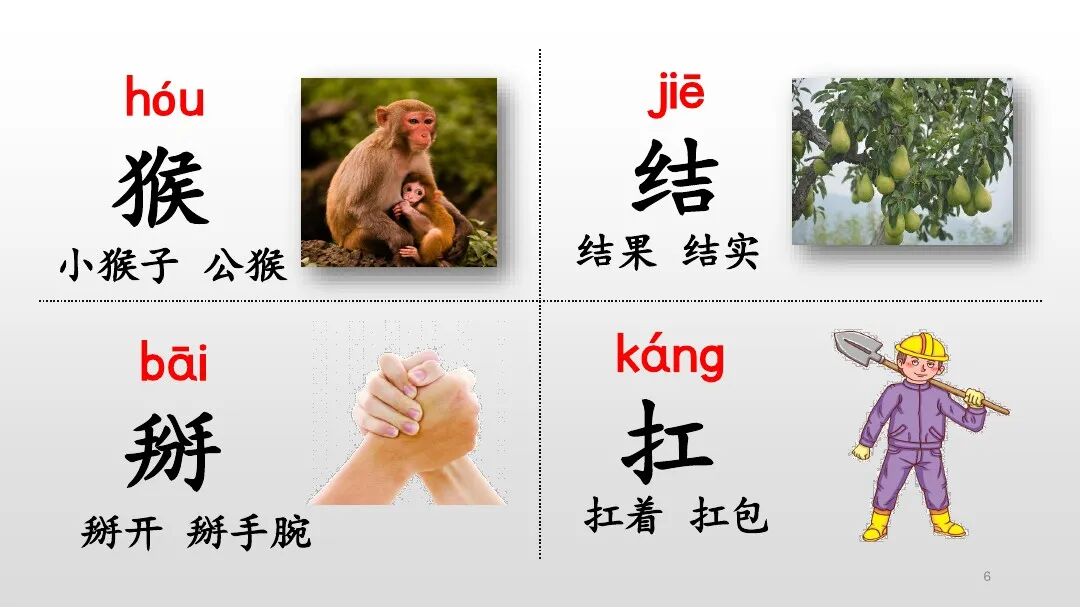 猴:反犬旁,很多表示动物的字都是反犬旁,最后一笔是“捺”;