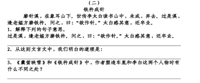 《囊萤映雪》是通过车胤在家境贫寒时像办法克服困难来读书的事例,表现他勤奋好学的品质;而《铁杵成针》是通过对李白前后不同的表现的刻画,表现了李白及时悔改而发奋用功的品质。