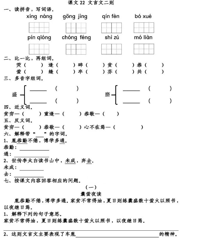 萤(萤火虫) 缝(门缝)卒(士卒)芬(芬芳)共(总共)