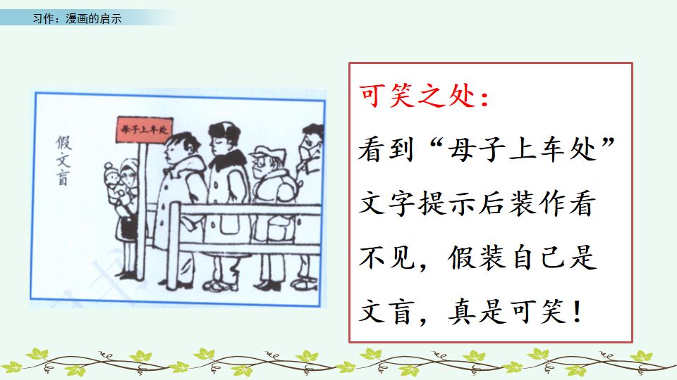 有的漫画让我们会心一笑的同时,也能让我们有所思考。今天,我就看到了这样一幅引人深思的漫画。一个人正拿着水壶要给他刚刚栽好的小树浇水,却看到有一个人坐在小树下。于是,他问那个坐在小树下的人:“你干什么?”那个人回答说:“等着乘凉。”这个等着乘凉的人多么可笑啊!这棵小树才刚刚栽好,根本不能遮阴,他却已经等着乘凉了。更可笑的是,这棵树并不是他自己栽的,他想要抢夺别人的劳动成果。他的行为是可耻的,没有人能不劳而获。看到这幅漫画,我不由得想到了我自己。每次做作业时,我一遇到不会的题目,就会大声呼唤爸爸,等爸爸来给我讲解,从来不自己思考。爸爸给我讲解完都会告诉我,下次要先自己动脑筋思考,实在想不出来才能去问他。我一边答应着,一边却在想:为什么要自己去费脑筋呢?反正爸爸都会帮我解决的。就这样,那些平时我不会的题目在考试中我还是不会,因此,考试成绩也总是不理想。冰心的诗中写着:“成功的花,人们只惊羡它现时的明艳!然而当初她的芽儿,浸透了奋斗的泪泉,洒遍了牺牲的血雨。”想想那些在奥运会上为国争光的奥运健儿,他们哪个不是经过了千万次的艰苦训练,才取得令人惊羡的成绩?在生活和学习中,我们不能想着不劳而获、坐享其成,因为抱着这样的想法,我们就会变得像漫画中的那个等着乘凉的人一样可笑。“一分耕耘,一分收获。”让我们行动起来吧,只有付出努力,我们才会有所收获!点评:小作者简要地描述了漫画的内容,接着从正反两方面详细写了自己从漫画中获得的启示,有理有据,条理清晰。另外,文中引用冰心的诗句非常恰当,也使“我”的感悟更深刻。