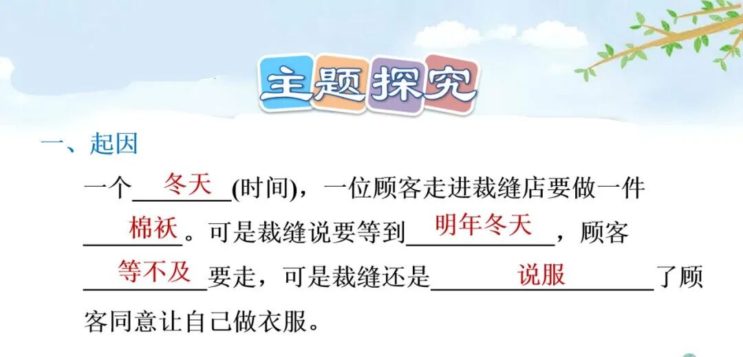 本文讲述一位急性子顾客找到慢性子裁缝要做一件棉衣,可他性子太急想早点穿上衣服于是让裁缝把棉衣改成夹袄、短袖衬衫、春装。可慢性子裁缝根本没开始做,他很生气。这个故事告诉我们:认准目标就要坚持,不要轻易改变,还要珍惜时间实现自己的目标。