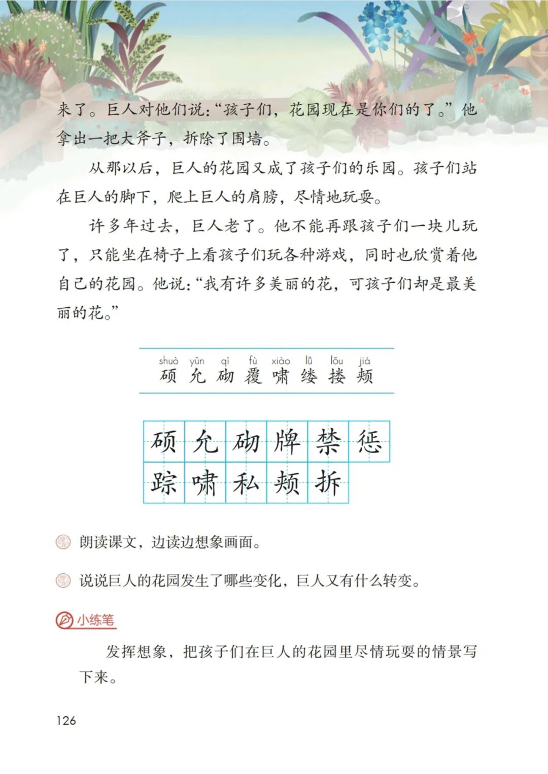 发挥想象,把孩子们在巨人的花园里尽情玩耍的情景写下来。