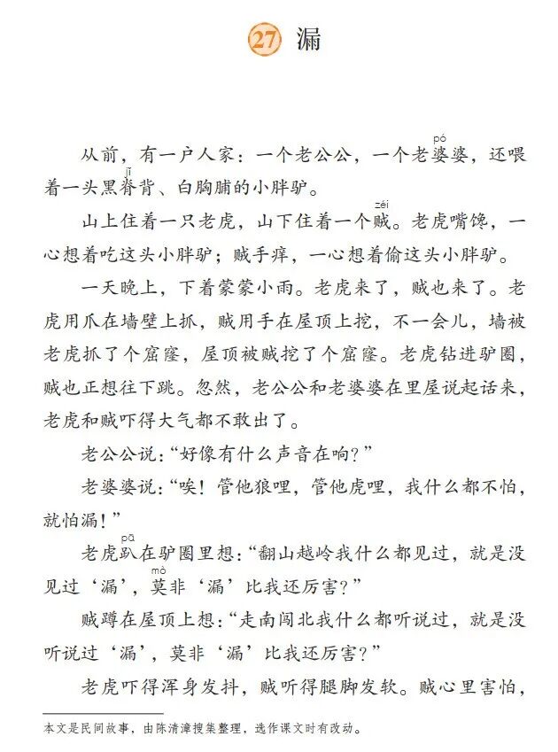 《漏》这篇课文是根据民间故事改写的。这个故事讲的是,一个月黑风高的夜晚,心怀鬼胎的小偷和老虎都来到老公公老婆婆家,可是,他们不约而同地遇上了 “漏”。画面充满童趣角色而又细腻传神,为我们呈现出一个幽默十足的民间喜剧。