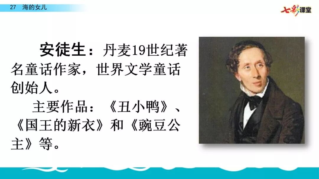 安徒生(1805—1875)19世纪丹麦著名的童话作家,被誉为“世界儿童文学的太阳”。其代表作有《小锡兵》《海的女儿》《拇指姑娘》《卖火柴的小女孩》《丑小鸭》《皇帝的新装》等。