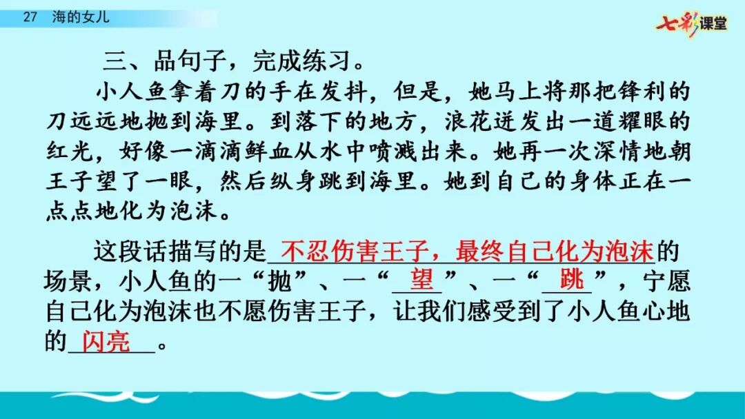 2、【品析】小人鱼拿着刀的手在发抖,但是,她马上将那把锋利的刀远远地抛到海里。到落下的地方,浪花迸发出一道耀眼的红光,好像一滴滴鲜血从水中喷溅出来。她再一次深情地朝王子望了一眼,然后纵身跳到海里。她到自己的身体正在一点点地化为泡沫。