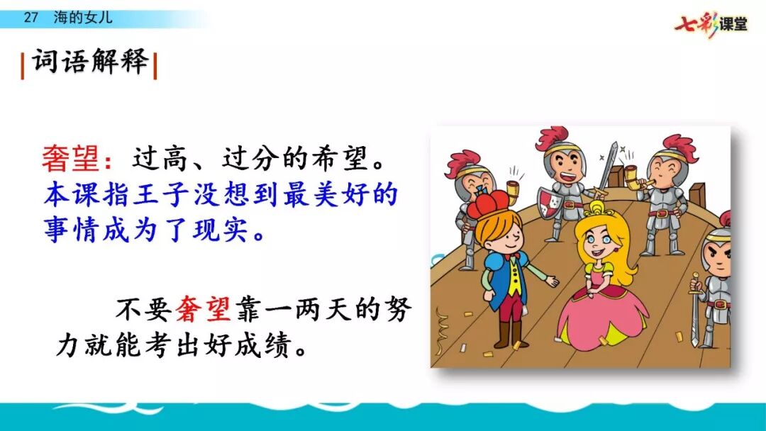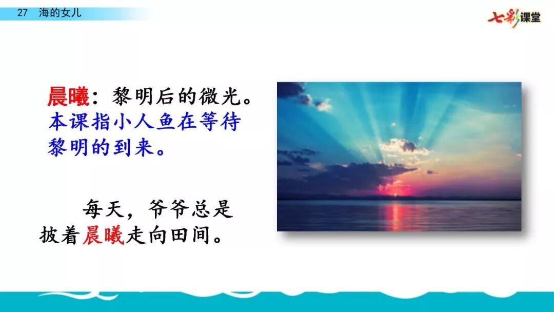 这篇课文是著名童话《海的女儿》的结尾部分。首次阅读时,按照事情发展的顺序理清故事的起因、经过和结果,把握文章的主要内容。再次阅读时,画出文中打动自己的地方,并多读几遍,和同学交流自己的感受。最后,在阅读中体会小人鱼的优秀品质。