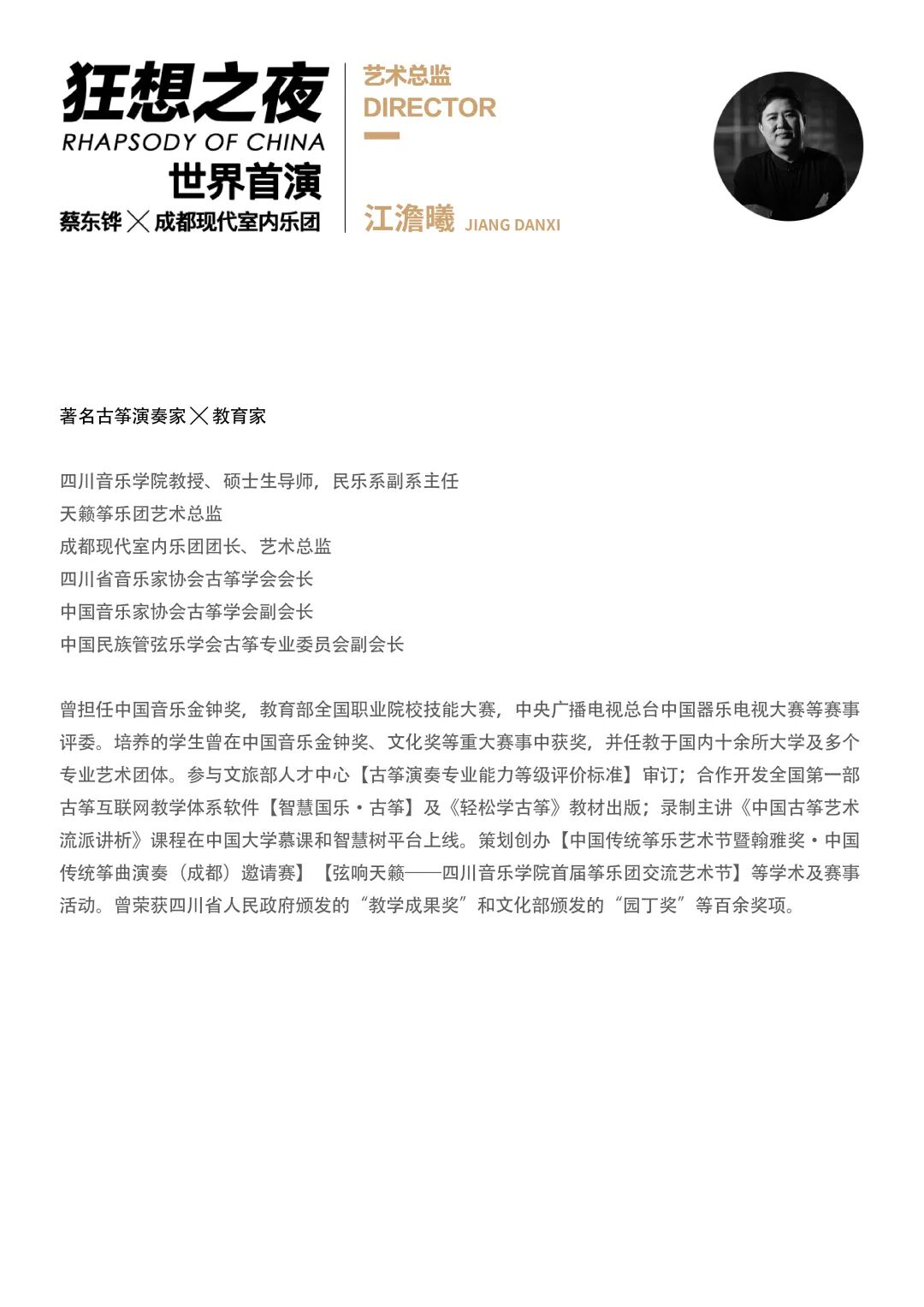 音乐总监:蔡东铧,指挥家 ╳ 作曲家 ╳ 戏剧导演,他是横跨国乐、交响乐、戏剧,最具探索和实践精神的当代艺术家,其作品具有开创性的艺术语言,能够发掘和反应人类多元且无限的精神世界,是当代“跨界&无界”探索融合最重要的践行者与引领者之一。