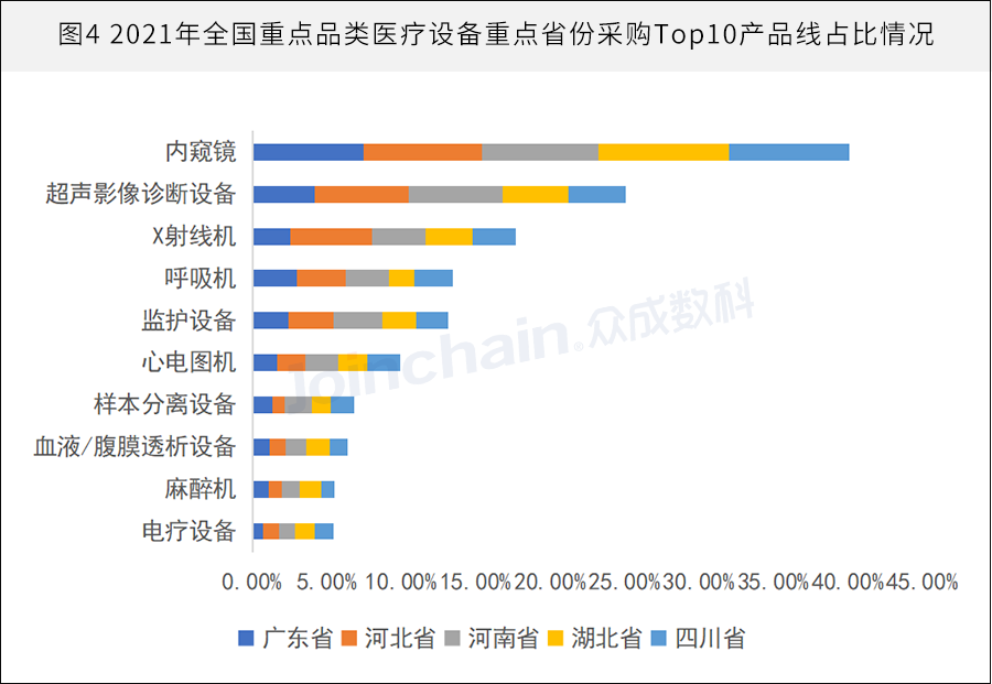 据众成医械研究院统计,2021年全国重点品类医疗设备采购量前十榜单中,内窥镜排名第一,占比接近45%。