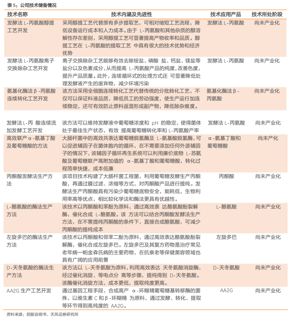● 丙氨酸:丙氨酸产品生产从天然提取、化学合成向现在主流的酶法、发酵法演变,后两者为代表的生物制造技术路线蓬勃发展是大势所趋。以生产L-丙氨酸为例,华恒生物的厌氧发酵法(利用可再生的葡萄生产)的关键技术已达到国际领先水平,公司毛利率水平达46%左右,远高于酶法L-丙氨酸10-13%左右毛利率水平。● D-泛酸钙:华恒生物自主研发的D-泛解酸内酯“一锅法”转化合成工艺(利用酶法的β-丙氨酸制备碳酸钙),相比如亿帆等同行使用的酶拆法,生产流程更为简化,一步获得了D-泛解酸内酯,大幅节省能源耗用。公司正在研发利用发酵法生产β-丙氨酸和D-泛酸钙技术,未来将进一步降低公司生产成本,2019年和2020年上半年,公司D-泛酸钙毛利率分别为67.11%和67.74%,维持在较高水平。2、技术储备丰富,未来将颠覆更多氨基酸领域的生产方法