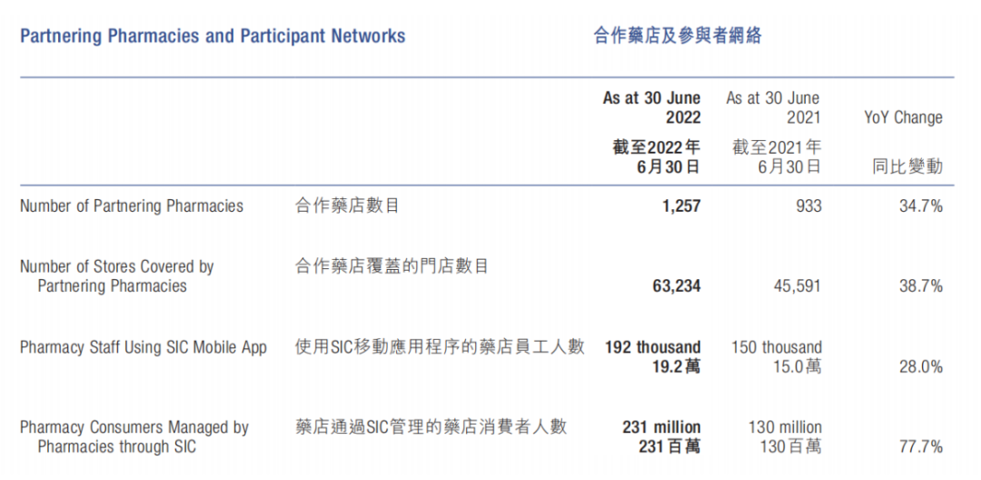 据艾瑞咨询报告,2020年底中康控股的合作药店GMV约为人民币461亿元,约佔2020年中国零售药店总额的10.5%。截至2022年6月,公司签约1257家连锁药店企业,覆盖63234家零售门店,占中国药店总数约11%,覆盖量坐稳行业第一的宝座。
