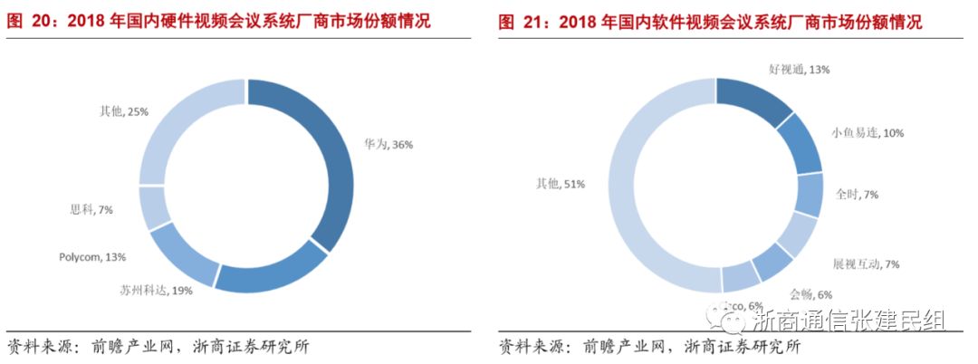 由于云视频行业处在高速成长期,以云视频会议为代表的软件会议市场竞争格局分散,2018年国内软件视频会议CR6市场份额为49%(2018年国内硬件视频会议系统CR4的市场份额为75%),预计未来行业集中度将有所提升。