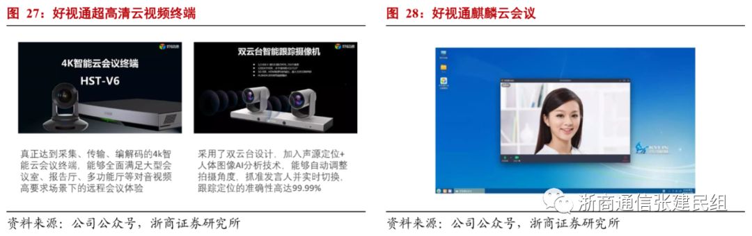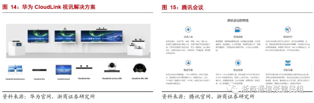 行业应用来看,以远程教育、远程医疗、远程办公等场景为代表的垂直行业对于视频会议的认知度和需求迅速提升,叠加云视频方式带来的成本下降,以及随着带宽能力、软件能力等提升带来的视频效果改善,预计未来将打开广阔需求空间,经过此次疫情,我们认为市场对于云视频这一新型生产工具的认知也将会进一步强化,利好行业长期发展。同时,随着云视频渗透率的逐步提升,行业案例的逐步累积,云视频对于政府市场、企业市场降本增效的促进提升作用越来越得到市场认可,云视频在行业的应用成熟度提升明显。此外,2019年9月华为发布全新CloudLink视讯解决方案(最早一代产品于2018年9月推出),搭配新一代智能协作终端、分体式视讯终端、高密度MCU和大容量SMC,其中视频会议终端CloudLink Box 300 & CloudLink Box 600支持H.265与4K超高清双流,并且AI能力全面升级,从单场景的智能演进成为基于角色的认知智能,让会议体验与效率更上一层;2019年12月,华为还发布新产品智能工作平台WeLink,助力用户随时、随地、通过各类终端设备实现协作办公;2019年12月,腾讯云针对跨企业、跨区域沟通协作的云视频会议产品腾讯会议也正式发布;此外,阿里云旗下也有音视频会议多功能互动解决方案云视频产品;华为、腾讯、阿里等巨头加码也将会大幅提升行业的市场关注度和客户认知度,带动行业发展。